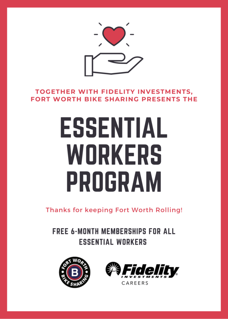 Fort Worth Bike Sharing is partnering with Fidelity Investments Careers and their Westlake, TX Regional Center to offer free 6-month long memberships for essential frontline workers.